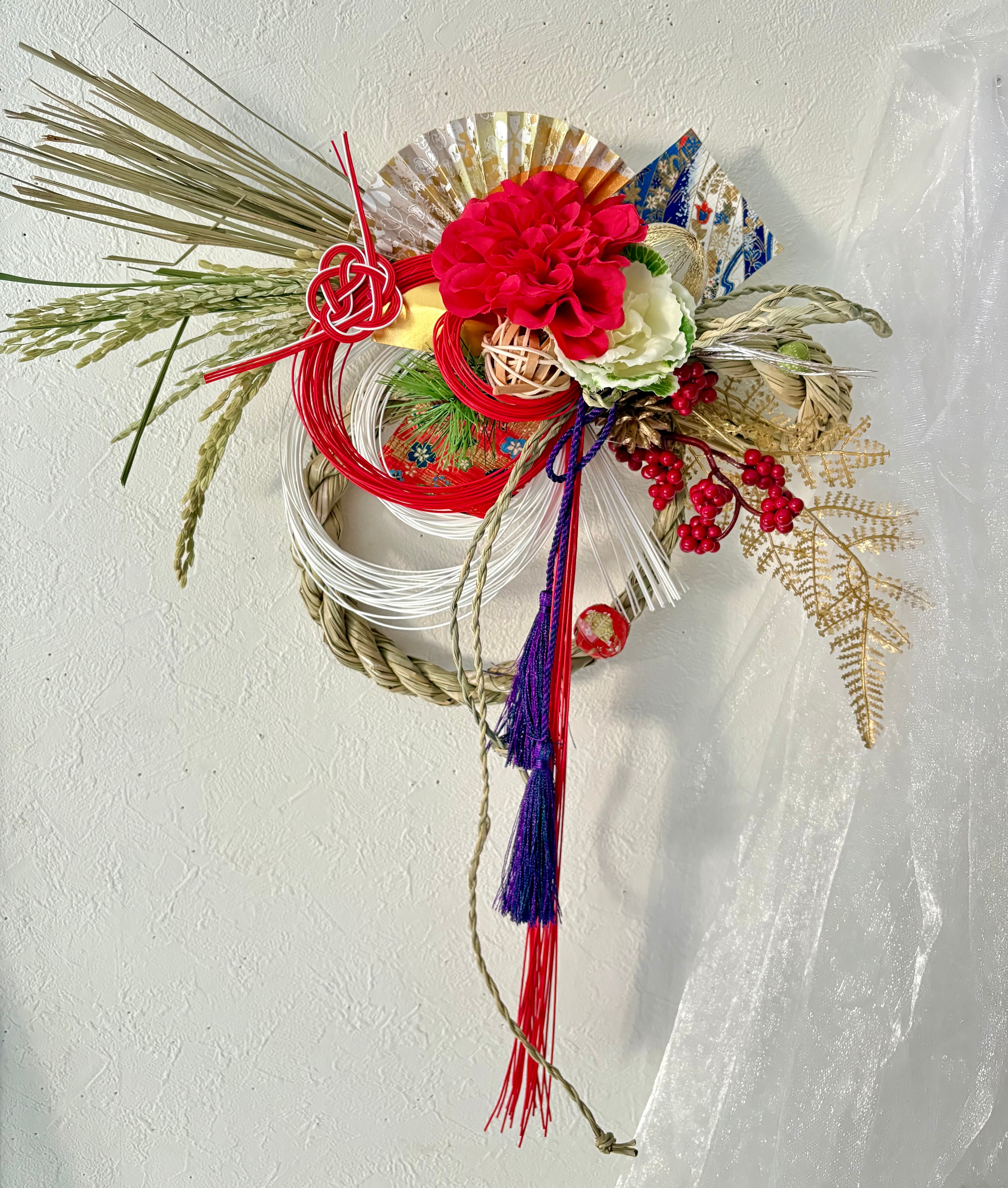 高貴で風格ある印象のしめ飾りです。豊かな色合いと繊細な装飾が、どんな玄関にも特別な魅力を添えます。お正月の飾りとしてはもちろん、大事な方への心温まる贈り物としてもお楽しみいただけるアイテムです!